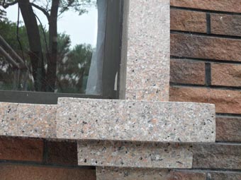 基層處理→批兩遍膩?zhàn)印⒖箟A抗鹽析底漆→刷帶色中涂→噴真石漆→噴涂罩光面漆